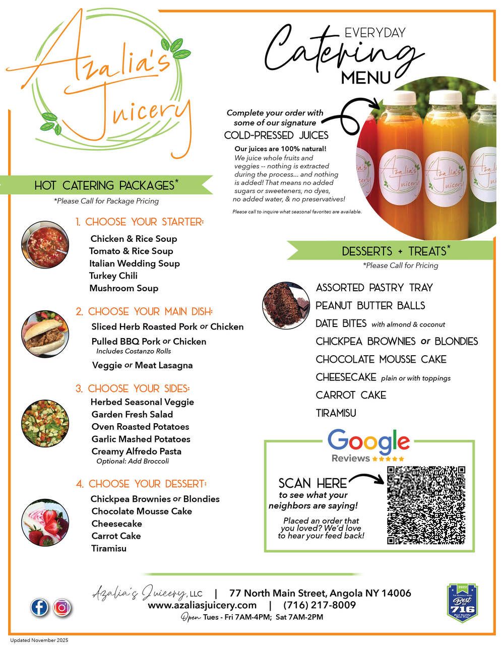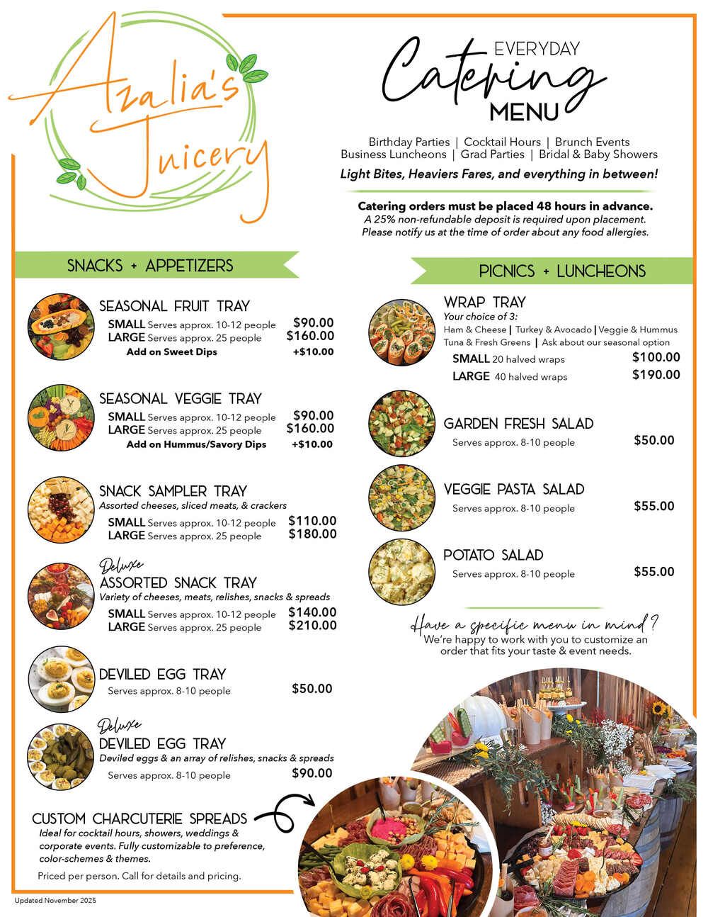 Azalia's Juicery offers catering services for events of all kinds in the Eden & Angola, NY area. Our healthy food options are perfect for any occasion, and we can customize our menu to fit your needs. We offer vegan and gluten-free options, and our locally sourced ingredients are always fresh and delicious.